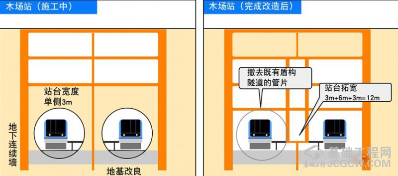 2013年,东京地铁开始对靠近中野方向的盾构隧道进行部分拆除后拓宽原有站台,这项世界首例拆除运营盾构隧道构筑新空间的工程具体内容如下: