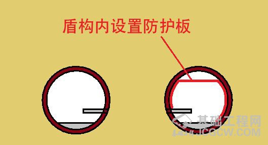 在开始挖掘作业之前,首先在盾构隧道内部设置了一道钢板曲线加工形成的防护板。通过防护板把施工区域和运营线路区域分隔开来,防止土砂和地下水流入。另外,在拆除管片时防护板还可用来架设导电线和照明灯具。