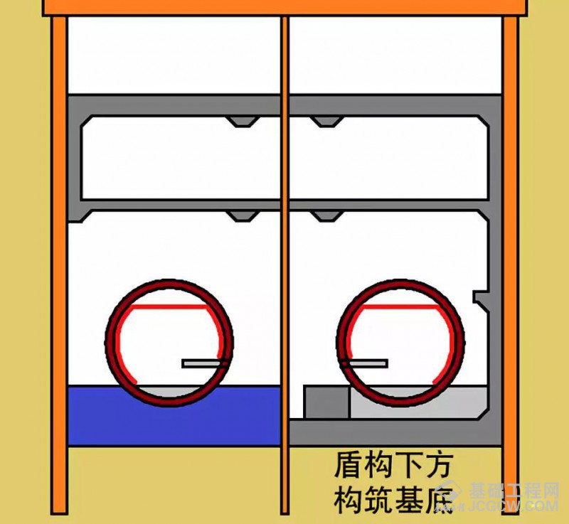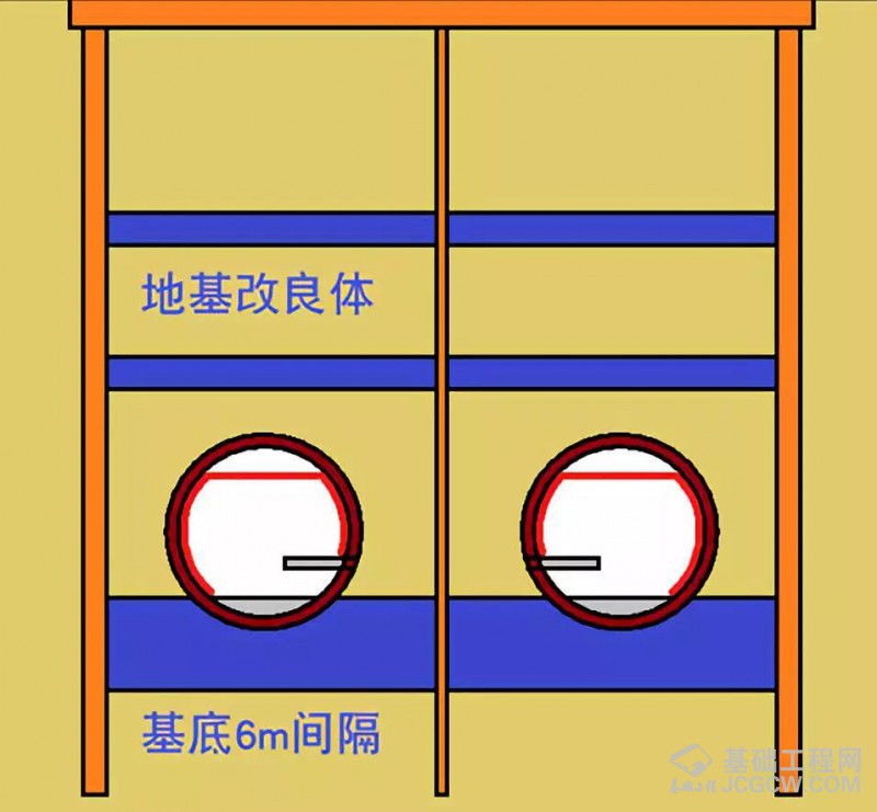 挖掘盾构隧道下方未经改良的土体,形成新隧道的基底。在该阶段,盾构隧道通过步骤③中完成改良的地基进行支撑。之后再挖掘改良后的土体。