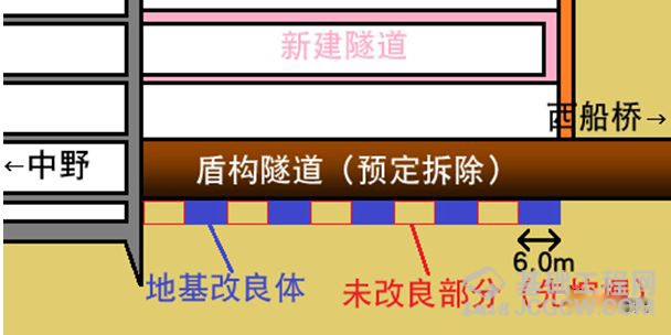 为了防止地下连续墙变形,对B2F顶板下和B3F顶板下深度的土体以及盾构隧道下方的土体进行了地基改良(先行基础梁)。此外,盾构下方每隔6m为未改良土体。