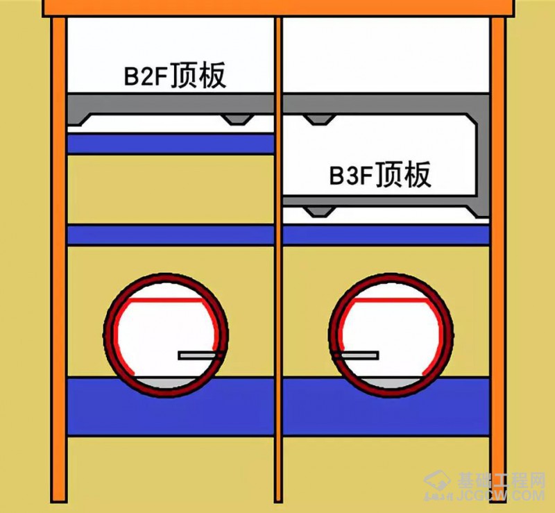 使用先拱后墙法挖掘地下连续墙内侧土体,构筑B2F。然后以同样的步骤完成B3F。