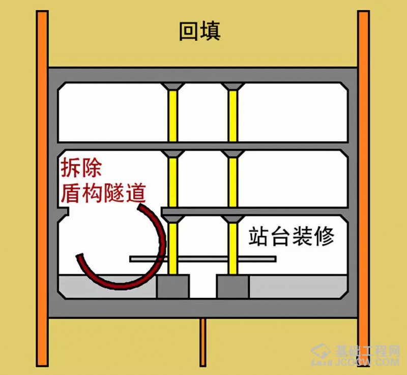 拆除盾构隧道,完成B4F顶板•站台装修等,B2F上方回填后完成整个施工。