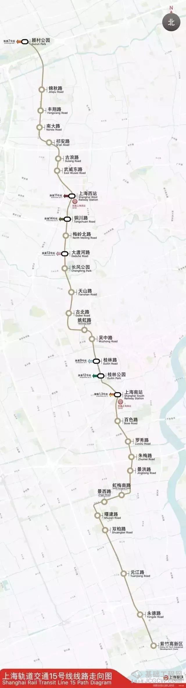 轨道交通15号线为上海市西部的南北向径向线,线路全长42.3千米,途经宝山区、普陀区、长宁区、徐汇区、闵行区5个行政区。