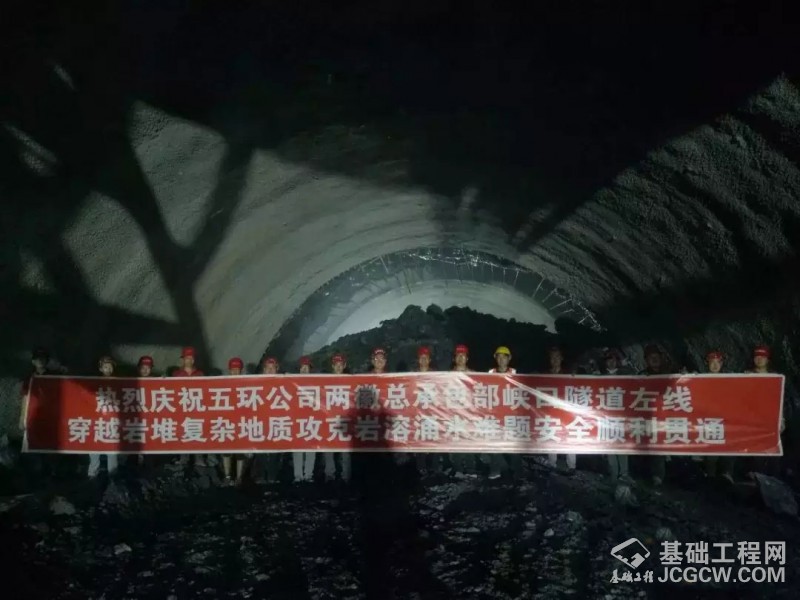 在施工过程中引进国际先进的“大型湿喷台车”,有效改善了隧道作业环境,减少了施工人员作业时间,降低了危险作业面安全风险,同时采用节能环保水压爆破施工技术和防水板电磁焊技术,提高了施工质量,历时728天,全体参建人员攻克了岩堆、岩溶、突泥、涌水等不良地质难题,峡口隧道左线安全顺利贯通。