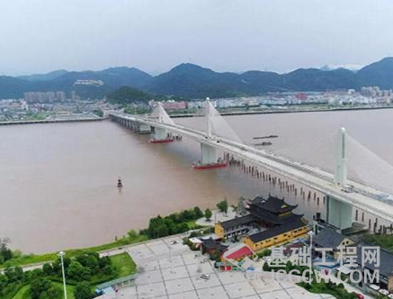 104国道温州西过境瓯江特大桥全长1332.72米,主桥桥面宽36米,是浙江省最宽的三塔矮塔斜拉桥。该桥采用双向六车道一级公路技术标准兼顾城市道路功能建设,主桥为单箱三室变截面连续刚构,主跨225米,采用挂篮悬浇施工,东、西引桥上部为连续T梁及现浇连续箱梁。