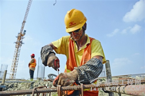 8月14日15时,成都地铁6号线一、二期工程的郫筒车辆段在建工地内,记者看到,数百名穿荧光褂的施工人员戴着安全帽抵达岗位,彼时户外温度约33度。45岁的赵红贵是钢筋工,每天要把主钢筋排好距离、再用箍筋把它们捆成一束一束的。钢筋热得“烫手”,需戴橡胶手套隔热。他说,一根钢筋几十斤,一天要捆上千斤。