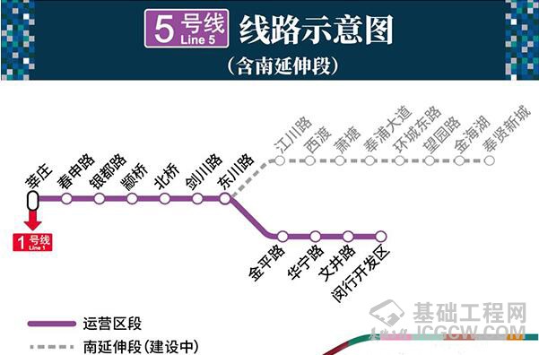 地铁5号线南延伸工程起点为既有线东川路站预留接轨点,终点为奉贤新城站,沿途经闵行和奉贤两区。延伸段线路全长约19.5公里,设江川路站、西渡站、萧塘站、奉浦大道站、环城东路站、望园路站、金海湖站、奉贤新城站共8座车站。