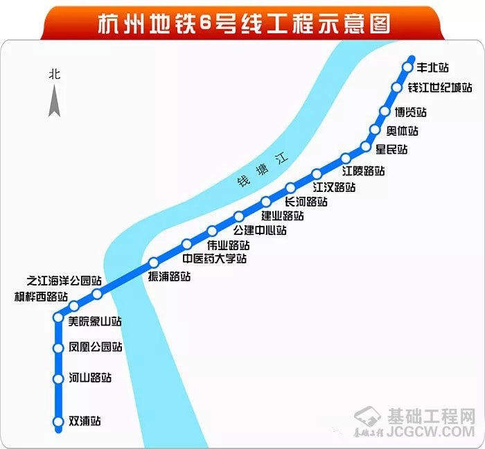 6号线一期:双浦站-丰北站,共19站26.5公里。江陵路站、钱江世纪城站、医药大学站作为换乘站,在地铁1号线、2号线、4号线建设时已同步完成。其余16座车站均已开工建设,其中有6座车站已完成主体结构。计划2020年建成通车。