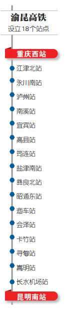 据介绍,渝昆高铁始于重庆西站,经重庆主城区、江津、永川等地进入四川省泸州、宜宾,而后进入云南省昭通、曲靖会泽接入昆明枢纽昆明南站。