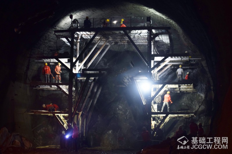 图为建设工人在隧道内作业。
