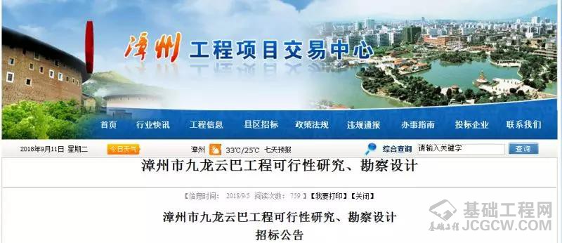 核心提示: 近日,漳州工程项目交易中心发布关于漳州市九龙云巴工程可行性研究、勘察设计招标公告,该项目建设地点位于漳州市台商投资区