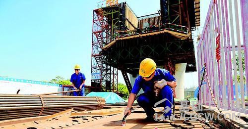 记者日前来到跨永石大道特大桥施工现场,看到工人正在焊接钢梁,一座座桥墩已经竖立起来。国庆假期,工地上一百多人放弃休假加班作业,目前跨永石大道特大桥桩基完成9成以上,承台完成8成以上,桥墩墩身完成6成以上,并已开始安装连续梁。