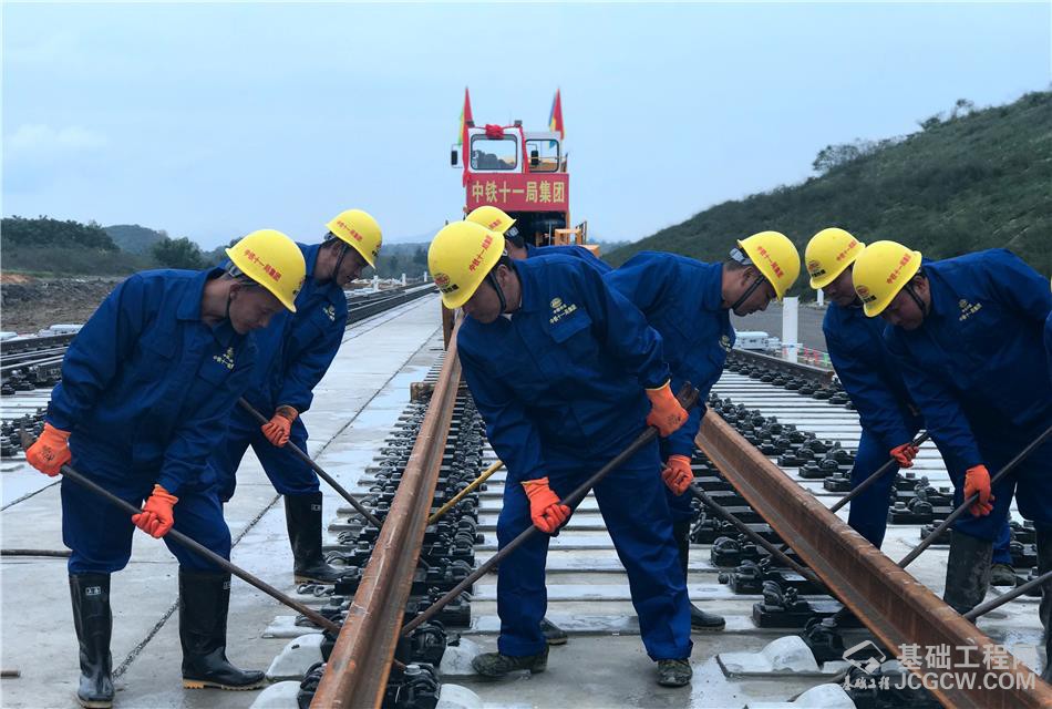10日上午11时许,成贵铁路云(南)贵(州)段在贵州省毕节市铺下第一对钢轨。据了解,成贵铁路云贵段采用了500米的特制长轨,预计2019年6月完成轨道铺设工作。