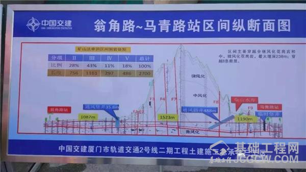 翁角路站~马青路站区间长达3.8公里,采用盾构法和矿山法双工法施工,其中盾构法1.1公里,穿越蔡尖尾山段2.7公里采用矿山法,为2号线最长矿山隧道。