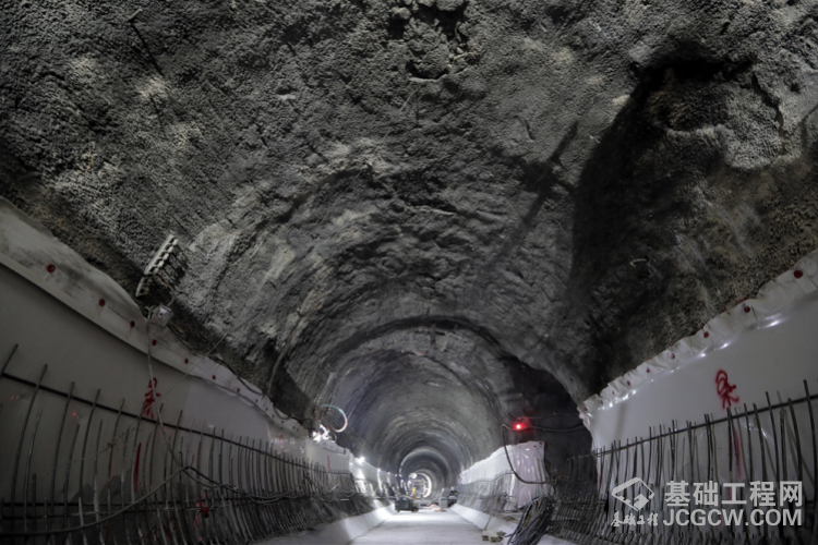 正在进行二衬施工的隧道,隧道顶部为矿山法施产生的褶皱。