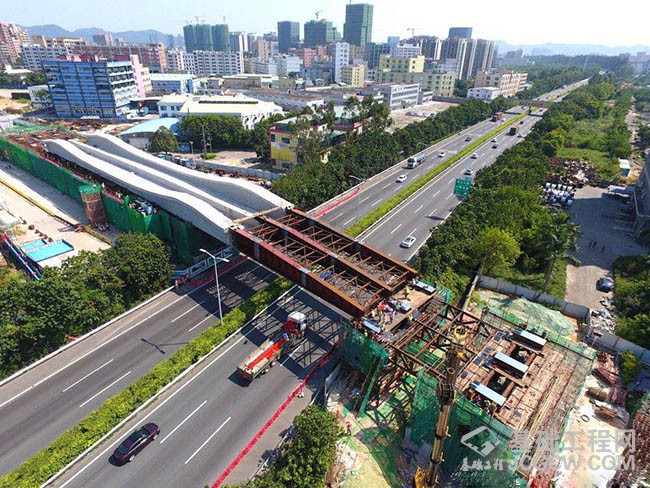 日前,历经12小时的连续施工,中国中铁广州局建设者们推着4600吨重的梁桥安全平稳顶进89米。当梁桥完全越过通行中的龙大高速公路,工地上沸腾了,这标志着中铁广州局创新的顶推法,在深圳地铁6号线高架段建设工地施工宣告成功。