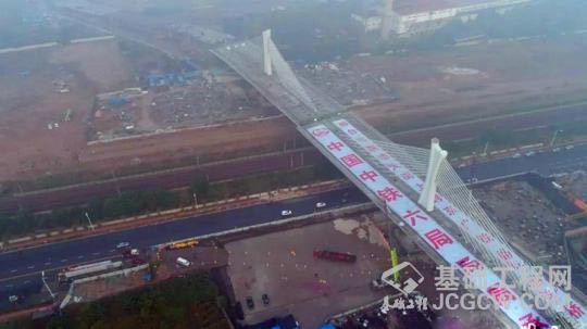 矮塔斜拉索转体桥跨越京广铁路,采用三跨矮塔斜拉桥形式,总长302m。