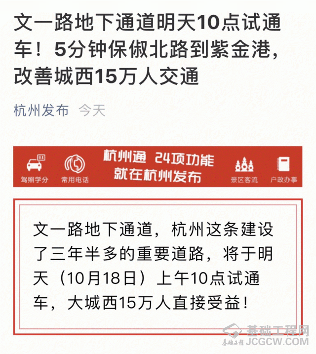 10月18日,由上海隧道工程有限公司承建的杭州文一路地下通道试通车!