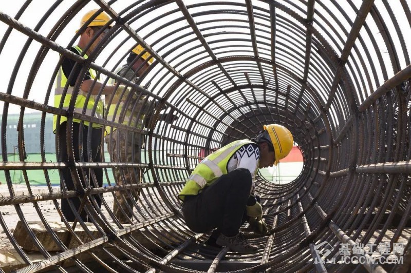 走进施工现场,小编看到,施工项目一侧工人正在一圈一圈焊接绑扎加固钢筋笼,为剩余的桩基部分做准备。另一侧工人正在清淤进行河底护砌和深基坑喷锚支护,为后续基坑开挖提供保障。