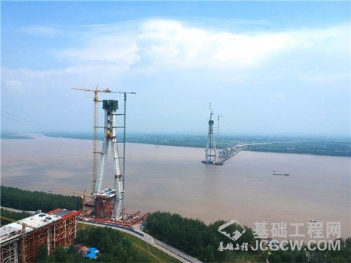 北岸主桥塔高237米,索塔采用新型的结构体系-皮肤功能混凝土和集聚锚钢横梁,均为国内首创。项目建设之初,各参建单位集中优势资源开展了皮肤功能混凝土和集聚锚钢横梁科研攻关,最终克服了一道又一道难关,分别于2016年9月开始北主塔首节塔柱施工、2017年12月进行索塔集聚锚钢横梁安装,如期完成了北主塔塔柱和六道集聚锚钢横梁安装施工,向大桥合龙贯通迈出坚实一步。