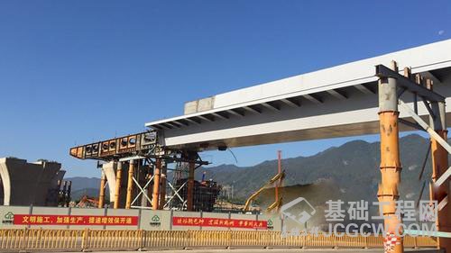 本月2日起,工人在墩身上搭设顶推施工拼装平台。13日,在工厂预制的钢梁节段被吊装到平台上,逐个焊接拼装。经过一周“三班倒”的奋战,一联50米长的钢箱梁拼装完成,“站”在墩身上。
