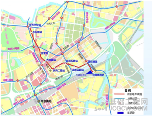本次规划是利用现有大校场机场专用线,改造为一条集交通、游憩、生态、人文、休闲等为一体的功能复合型线路,将现状单线铁路改造为双线,设计时速50公里。全线共设9座车站,平均站间距为710米。站点分别为营养学校站、永乐路站、宜家站、大明路站、夹岗二路站、夹岗五路站、油库公园站、国际路站、佳营南路站。其中,营养学校站可以换乘地铁3、8号线,大明路站可以换乘3号线,夹岗五路站可以换乘6号线,国际路站可以换乘5号线。