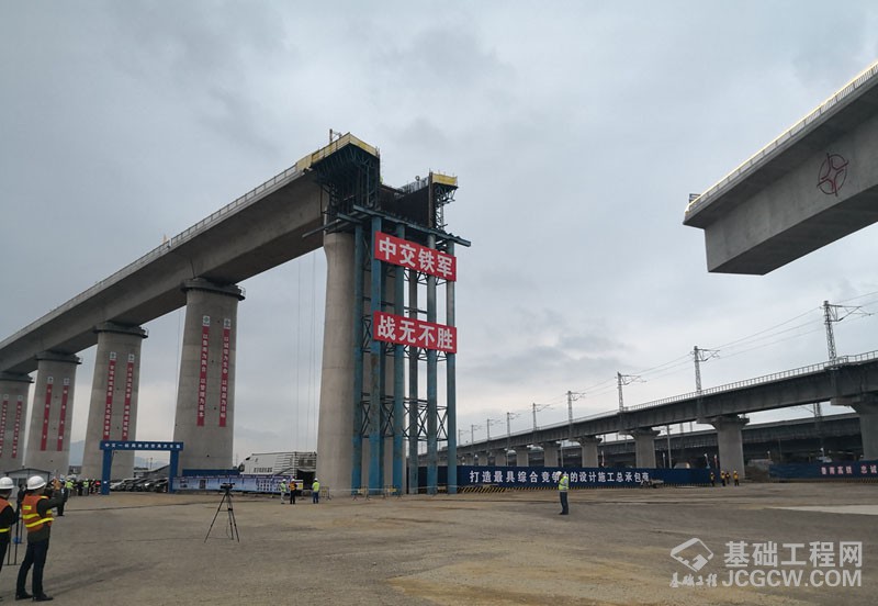 中交一航局承建的鲁南高铁肖家庄特大桥,地处日照市岚山区,全长2.64公里,其中,主跨为144米的转体连续梁,梁体全长301.6米,宽12.6米,主墩顶梁高11米,桥梁总高度为32米,全桥纵坡19.2‰,转体桥梁重量达2.5万吨,相当于40万人的重量。特大桥连续梁施工与既有线路最小距离仅仅0.4米,是目前国内高铁建设中跨度最大、梁高最高、距离既有铁路线最近、施工安全风险等级最高以及双T构转体最长的大纵坡连续梁,为鲁南高铁全线的重点控制性工程。