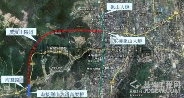 罗汉山隧道位于荆山大道最北端,是荆门市中心城区“三环八射六隧”规划中的一隧。