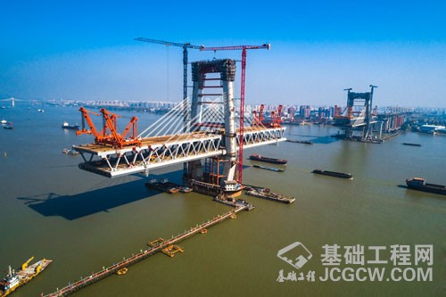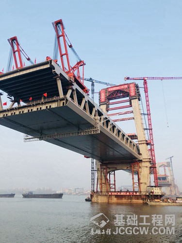 “主塔有了强健的‘体格’,还得‘站’得稳,这样大桥才能牢靠。”据刘爱林介绍,桥址处地质极为复杂,从中间分界,南边河床面为光板岩,其特点是非常光滑,且硬度高,对于主塔基础而言不易“扎根”,因此,进行南主塔施工时在国内首次采用了设置钢沉井基础,即根据沉井尺寸对深水基岩进行水下爆破成型,再将平面尺寸为65米×35米(相当于5个标准篮球场大小),高19.5米(相当于7层楼高)的庞然大物浮运至此下沉。北主塔河床为破碎岩层,在基础施工中极易出现塌孔现象,需深入钻孔,最大孔深达103米(约为37层楼的高度),施工难度极大。