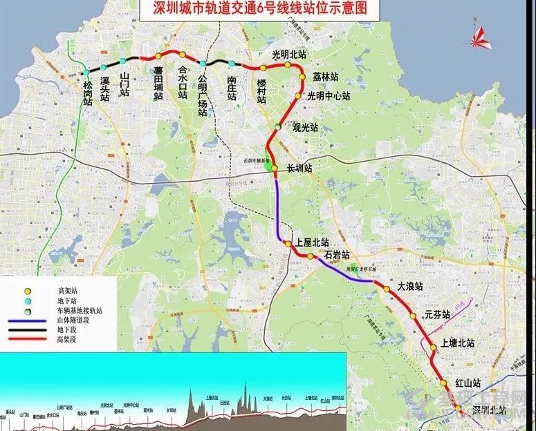 深圳地铁6号线分一、二期工程,一期工程线路起自深圳北站,终于松岗站并与地铁11号线换乘,线路全长约37.6公里。