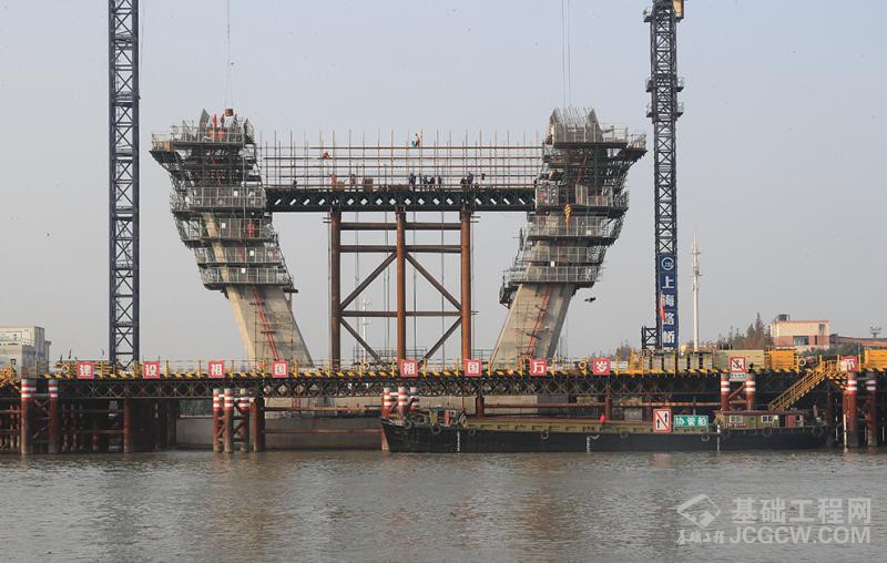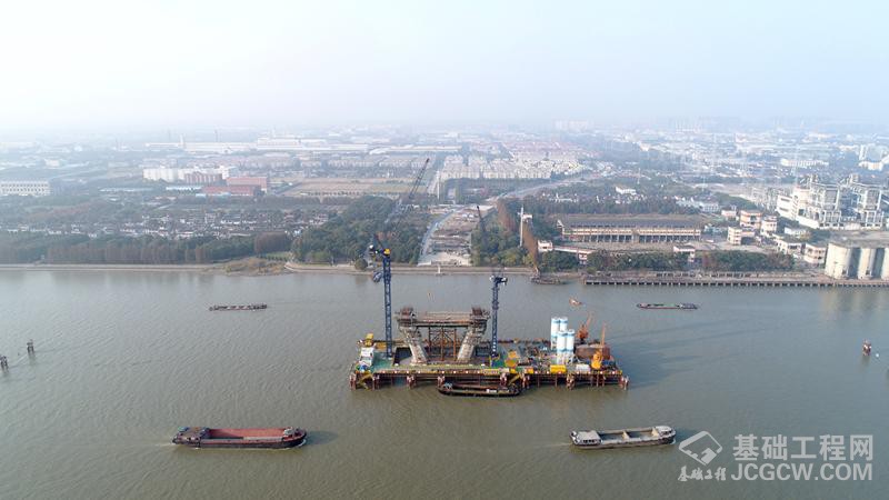 这项技术首次在跨江大桥中使用,有效减少了现场支架现浇的工作量,施工中部件出现问题也容易替换,理论上缩短了1/3的施工时间。主塔承台作为136米高“钻石型”主塔基础,分成两次进行浇筑,从而降低连续作业对水上交通带来的不利影响。