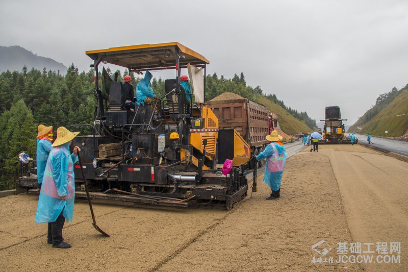 路面1标冒雨进行水稳底基层摊铺