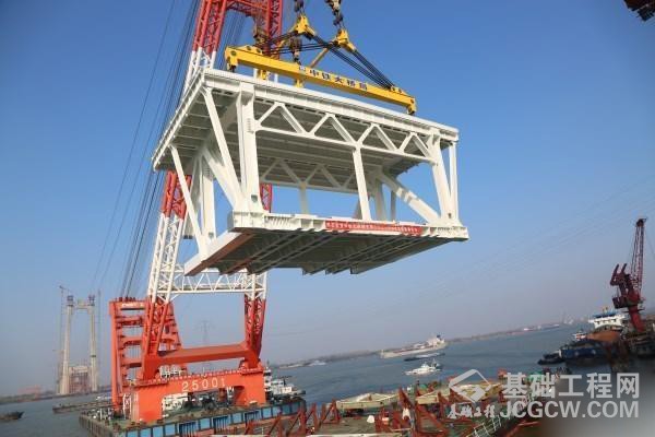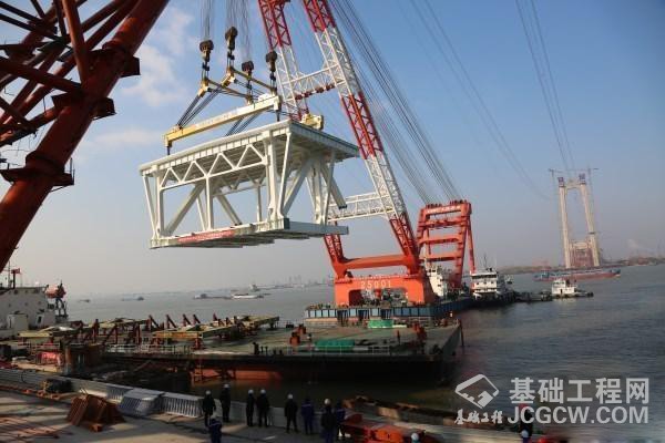 五峰山长江大桥首个边跨大节段钢梁架设成功