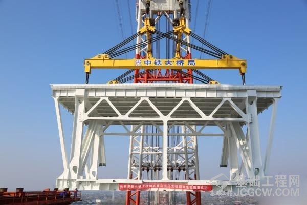 据中铁大桥局集团有限公司连镇铁路项目经理部常务副经理陈明介绍:“五峰山长江大桥全桥钢桁梁节段53个,其中两侧边跨钢桁梁各8个,主跨钢桁梁37个,本次为南岸边跨E0’E1’节间钢桁梁架设,同时也是大桥首次钢梁架设,意义重大”。