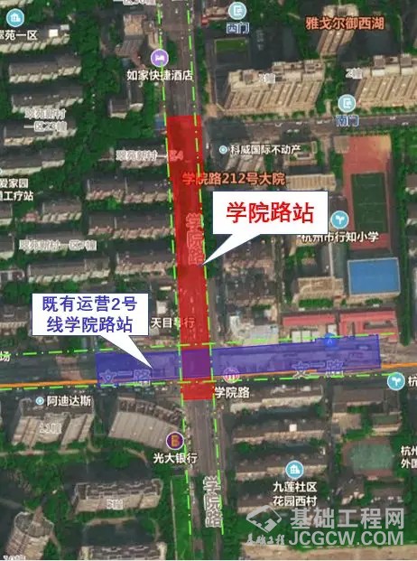 杭州地铁10号线学院路站位于文二路和学院路交叉路口,沿学院路南北向布置,为10号线与既有2号线实现换乘的车站。10号线车站为地下三层双柱三跨箱型结构,总长198.4米,宽24.6米,共设3组风亭、5个出入口。