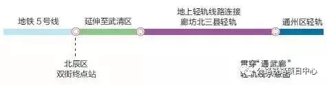 据天津市武清区发改委介绍,正在规划中的“通武廊”轻轨线路,将充分利用天津市地铁5号线,从其北辰区双街终点站延伸到武清区,到达武清区后改为地上轻轨线路,然后一直延伸到河北省廊坊,和当地规划兴建的北三县轻轨连接,最后直接到达北京城市副中心──通州区。