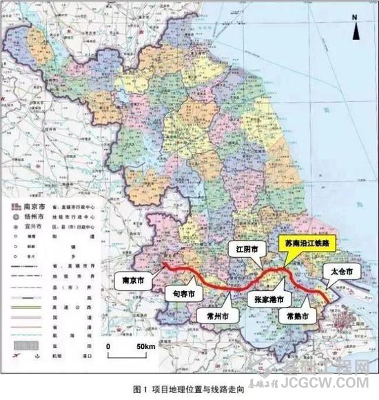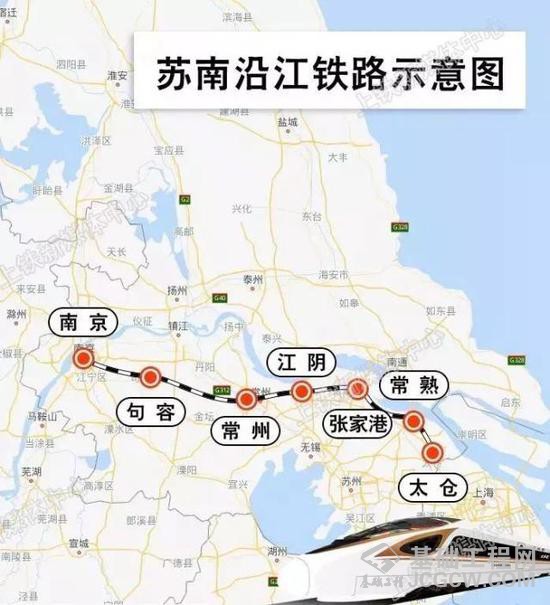 苏南沿江铁路是时速350公里的高速铁路,线路自京沪高铁南京南站引出,向东经句容市、金坛区、武进区、江阴市、张家港市、常熟市,终至在建的沪通铁路(上海—南通)太仓站。新建正线长度278.53km,全线共设南京南、句容、金坛、武进、江阴、张家港、常熟、太仓等8个车站,建设工期为4年。