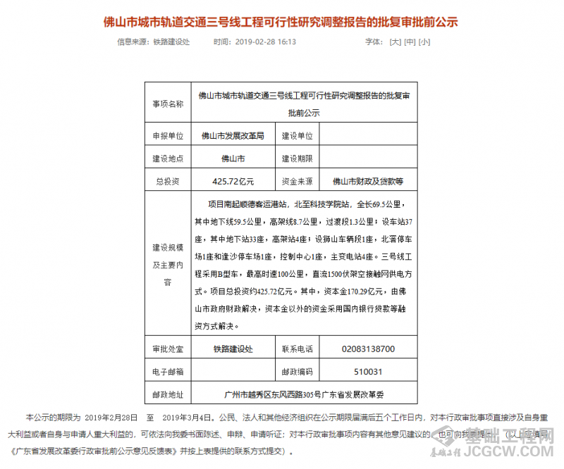 2月28日,广东省发展和改革委员会网站发布佛山市城市轨道交通三号线工程可行性研究调整报告的批复审批前公示。