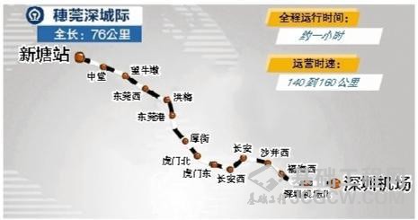 穗莞深城际铁路起点为广州市增城区新塘镇,通过广深铁路连接广州东站,终点为深圳机场站,全长约76公里,全线共设15个车站(高架站10座,地下站5座)。穗莞深城际铁路时速140到160公里,列车载客1200人,建成后将实现公交化运营,全程运行时间1小时,将与国家铁路、城市地铁无缝接驳,成为沟通广州、东莞、深圳三市的快速交通通道。