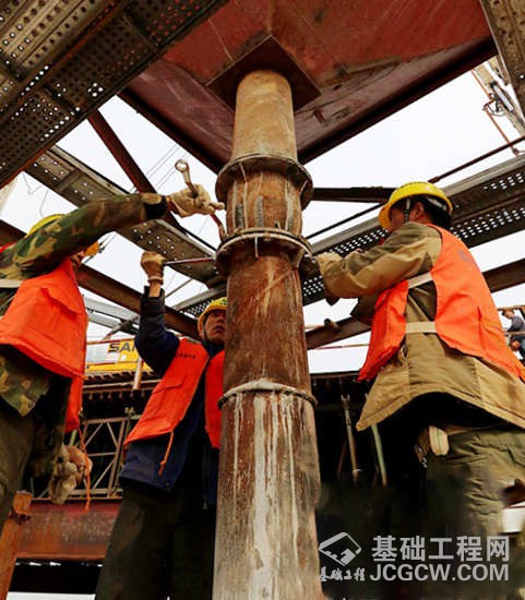 4号主塔墩位于主航道内,水文地质情况复杂,基岩强度高、且岩溶发育、呈串珠状,河床岩面覆盖层厚达17米左右。围堰下放过程中采用10台吸泥机在围堰四周24小时同时作业,历经30个昼夜,将长59.4m、宽40.6米、重达4800吨的矩形钢围堰底端下放着床;下放到位后的围堰底端与围堰设计抽水水位达35米的水头差,是目前长江流域水头差最大、下放深度最深的矩形钢围堰。
