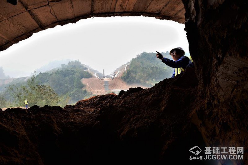 4月15日,在老挝乌多姆赛省,中国中铁五局工程师在已经贯通的那通二号隧道洞口工作。