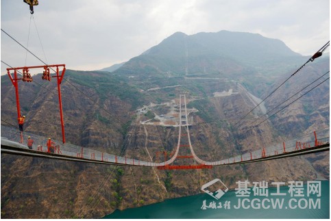 中交二公局华丽高速金沙江大桥项目项目经理王凤存介绍道:在金沙江大桥左右幅主缆下方各设一条猫道,将大桥华坪、丽江两岸主塔相连。猫道宽4米,最低点距江面348.8米,最高点距江面478米。为提高抗风稳定性,大桥采用不设抗风缆的连续式猫道,其主跨设7道横向通道,边跨各设1道横向通道。