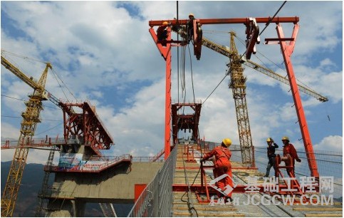 中交二航局华丽高速金沙江大桥项目项目经理王连彬介绍说:金安金沙江大桥隧道式锚碇洞口处左右隧洞净距较小,洞底处左右隧洞净距仅为10m,为小净距隧洞,隧洞开挖向下倾角大,开挖断面大。为解决这一技术难点,项目部委托中国科学院武汉岩土力学研究所开展了近接施工工艺研究,研究了锚洞与下方新民隧道之间相互施工的影响,确定了两侧锚洞错开开挖施工方案;针对开挖断面大,制定了专项爆破设计,控制爆破震动,同时采用分台阶开挖,分节段支护的方案,确保安全施工 ;针对锚洞倾角大,采取了洞外设置卷扬机,洞内设置轨道,形成了卷扬机+矿车牵引系统,将洞内开挖弃渣装入矿车,利用卷扬机提供牵引力,通过钢丝绳将矿车牵引出洞外。同时施工所用挖掘机也该牵引系统进行牵引和下放。