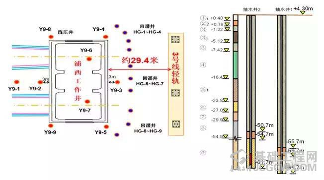 该工程浦西工作井长70 m×宽26.8 m×深33.65m,为深大基坑。基坑紧邻正在运营的轨交3号线高架、逸仙路高架和一些重要管线,保护要求很高。施工中,对⑨1层承压水层进行降水,通过现场单井、群井抽水试验及回灌试验,确定降水井结构及布置、回灌井的布置、回灌的相关参数等,最终通过降水回灌及施工过程质量控制管理,很好地控制了周边高架桩基的沉降,确保基坑开挖的安全。