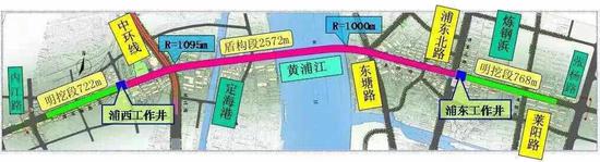 周家嘴路越江隧道西起浦西杨浦区周家嘴路内江路交叉口、沿周家嘴路向东入地后依次下穿军工路、上海理工大学、复兴岛、黄浦江、浦东大道等,沿东靖路向东,至浦东新区东靖路张杨路交叉口,长约 4.45千米。