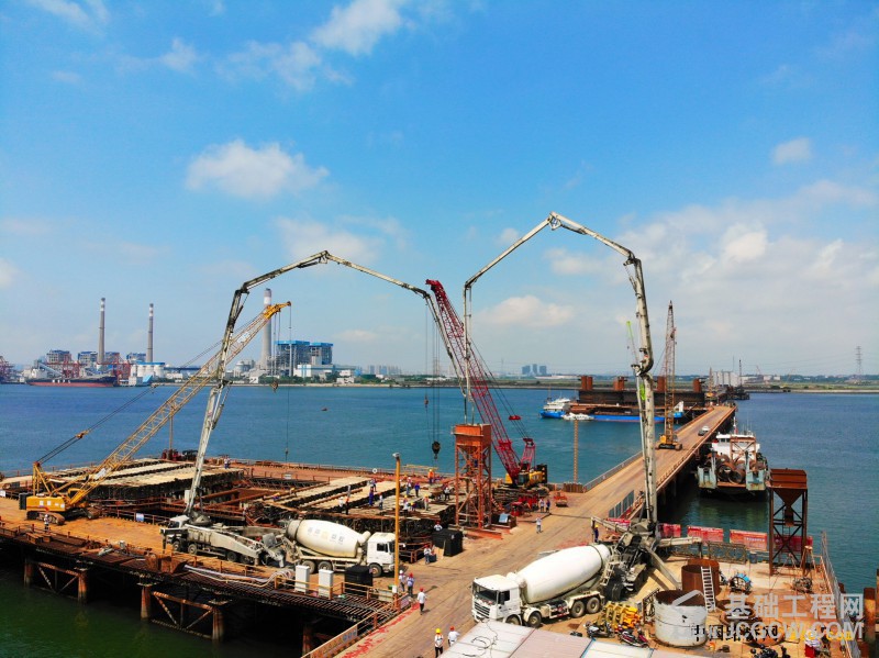 据调顺跨海大桥主墩负责人蒋稳齐介绍:“调顺跨海大桥91号主墩钢围堰为“哑铃型”围堰,平面尺寸1500平方米,接近4个篮球场那么大。封底混凝土分两次浇筑,第一次浇筑高度1.5米、浇筑方量1473.1方,采用水下封底浇筑,从上游侧向下游侧逐步推进浇筑;第二次浇筑高度0.5米、浇筑方量491.0方。封底完成后,围堰内的水会被全部抽排,为主墩承台创造无水的施工环境,对主桥整体施工速度有着重要意义。”