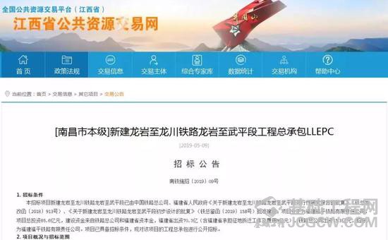 5月8日,福建福平铁路有限责任公司在中国采购与招标网、铁路建设工程网、江西公共资源交易网上发布了《新建龙岩至龙川铁路龙岩至武平段工程总承包LLEPC》招标公告。