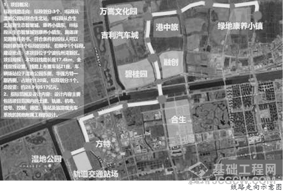 从该工程业主单位——宁波杭州湾新区海捷旅游基础设施建设有限公司了解到,杭州湾新区轨道交通一期工程总投资28.9亿元,项目线路长度17.4公里;全线双线设置,布置车站21座;车辆场站位于湿地公园东侧及华强方特一期西侧,占地约120亩。