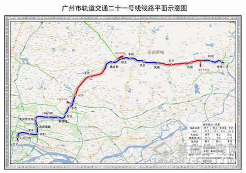 二十一号线全长61.5公里,共设21座车站。其中,增城广场至镇龙西段长26.2公里,设9座车站,已于2018年底开通;员村至镇龙西全长35.3km,设12座车站。全线铺轨长达136.37公里,为了加快施工进度,全线分3个施工标段,共设10个铺轨基地,投入轨道车、焊轨机、铺轨龙门吊等专用机械设备60多台套,高峰时共有超过1000名施工作业人员同时作业,历时19个月终于顺利完成施工任务。
