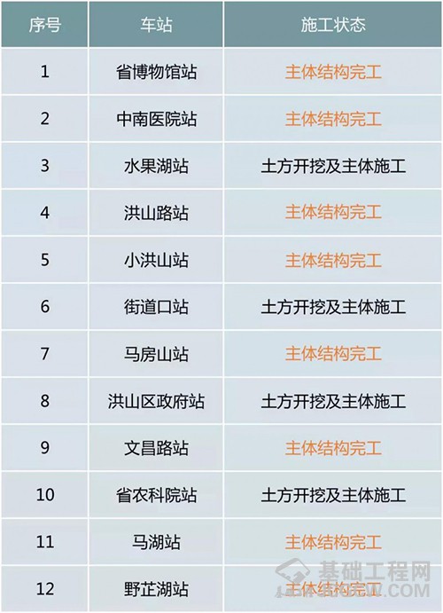 目前,主体完工8站(省博物馆站、中南医院站、洪山路站、小洪山站、马房山站、文昌路站、马湖站、野芷湖站),土方开挖及主体施工4站(水果湖站、街道口站、洪山区政府站、省农科院站)。